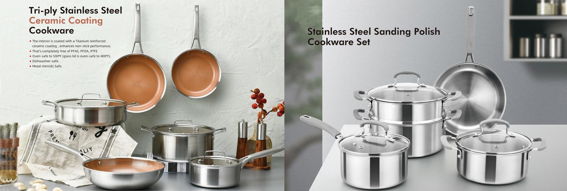 Juego de utensilios de cocina martillados antiadherentes de acero inoxidable Triply plateado, 6 ollas y sartenes con revestimiento de cerámica, material metálico